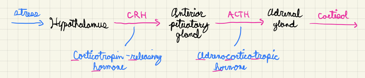 Cortisol is a glucocorticoid produced by the adrenal gland as part of the stress response.