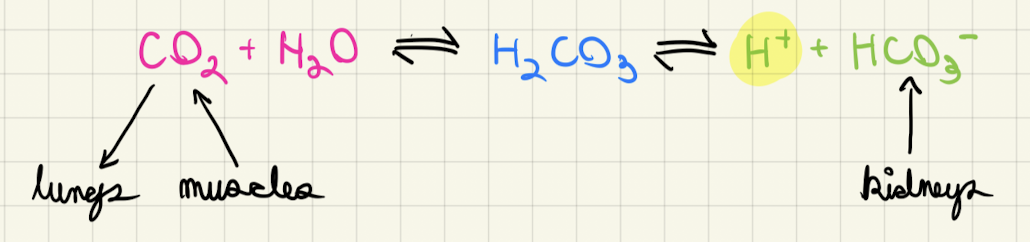 - Bicarbonate from the kidneys binds with free (acidic) hydrogen ions (H+) in the bloodstream to form Carbonic Acid.