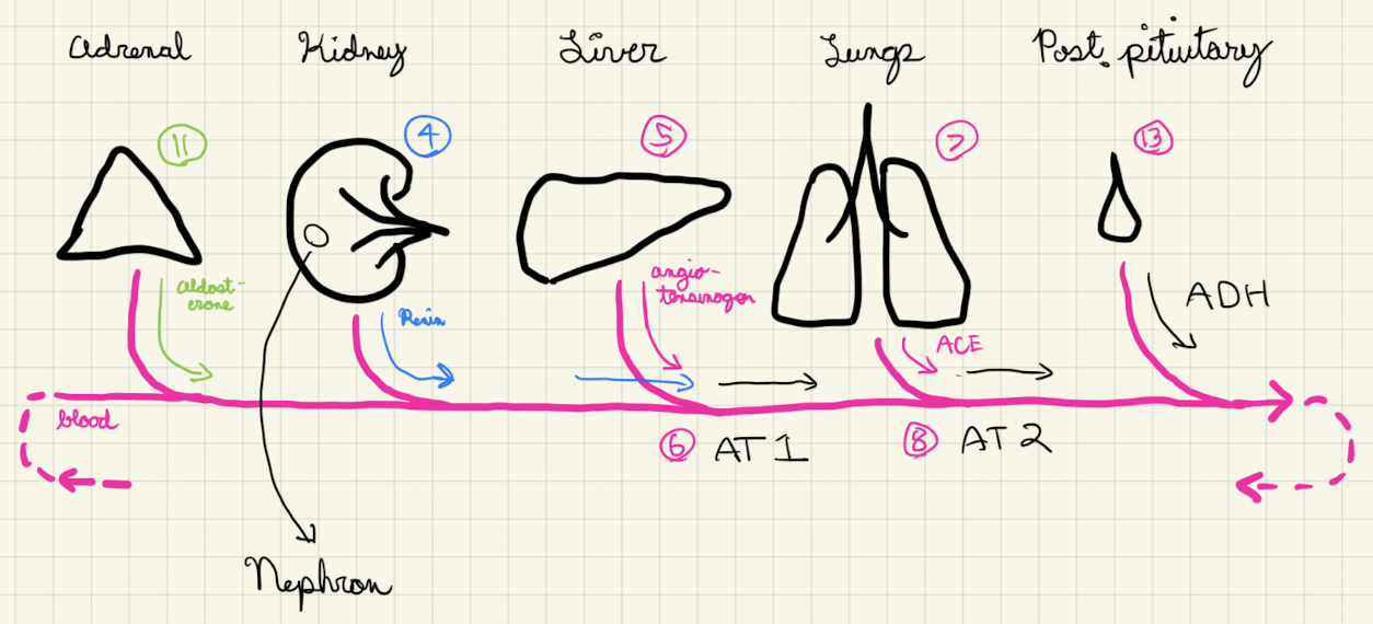 4. AT1 is converted into angiotensin II by angiotensin converting enzyme produced in the lungs.